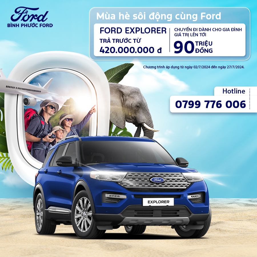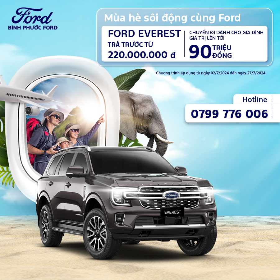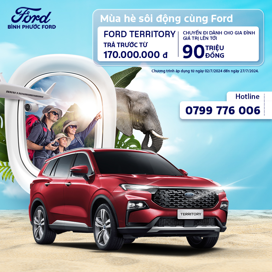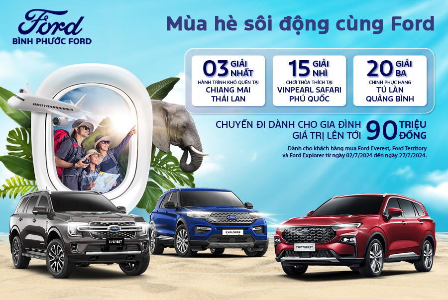– Từ nay đến hết 27/7/2024 quý khách hàng mua xe Ford Everest, Ford Territory và Ford Explorer sẽ có cơ hội nhận được chuyến du lịch tại Thái Lan 5N4D, Đảo Ngọc Phú Quốc 4N3D hoặc chinh phục hang Tú Làn, Quảng Bình 4N3D