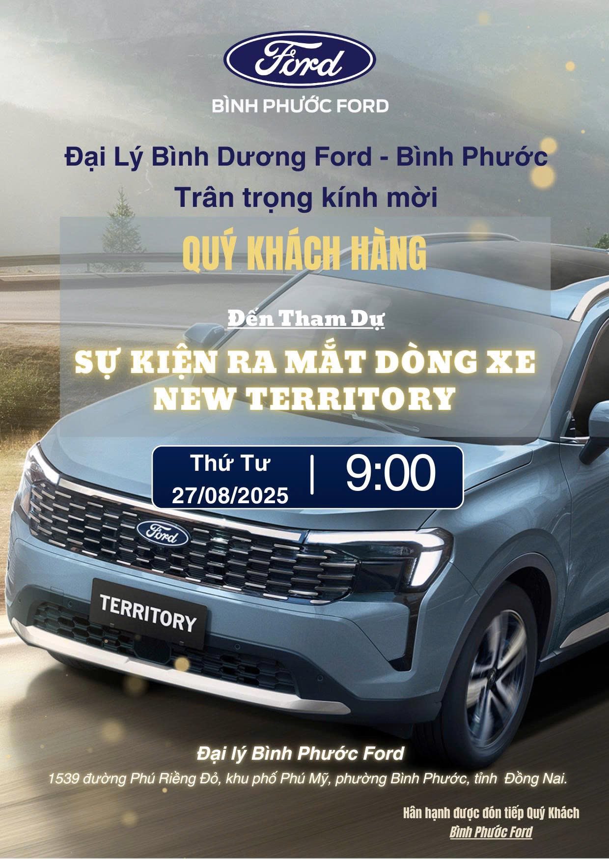 Ngày 27/08/2025, Bình Phước Ford hân hoan tổ chức lễ ra mắt dòng xe Ford Territory hoàn toàn mới – mẫu xe đang được mong đợi nhất năm. Đây là cơ hội để Quý khách hàng, Quý đối tác trải nghiệm trực tiếp siêu phẩm SUV hiện đại cùng nhiều hoạt động hấp dẫn.